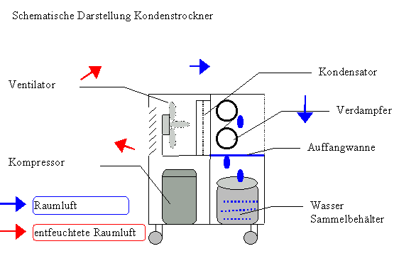 Der Kondenstrockner arbeitet nach dem Kondensationsprinzip (siehe Skizze) und eignet sich für Räume mittlerer Größe in Wohnungen und auf Baustellen zum Entziehen der Baufeuchte.